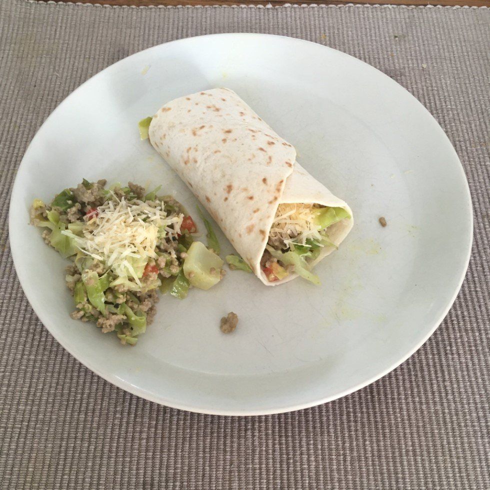 fruit de ui met de knoflook en het gehakt. bak de gesneden spitskool en paprika mee. Voeg daarne de creme fraiche toe en de kerrie. laat 10 min pruttelen. Verwarm de wraps volgende de verpakking. Vulde warme wraps met de groente en bestrooi met geraspte kaas. eet smakelijk!